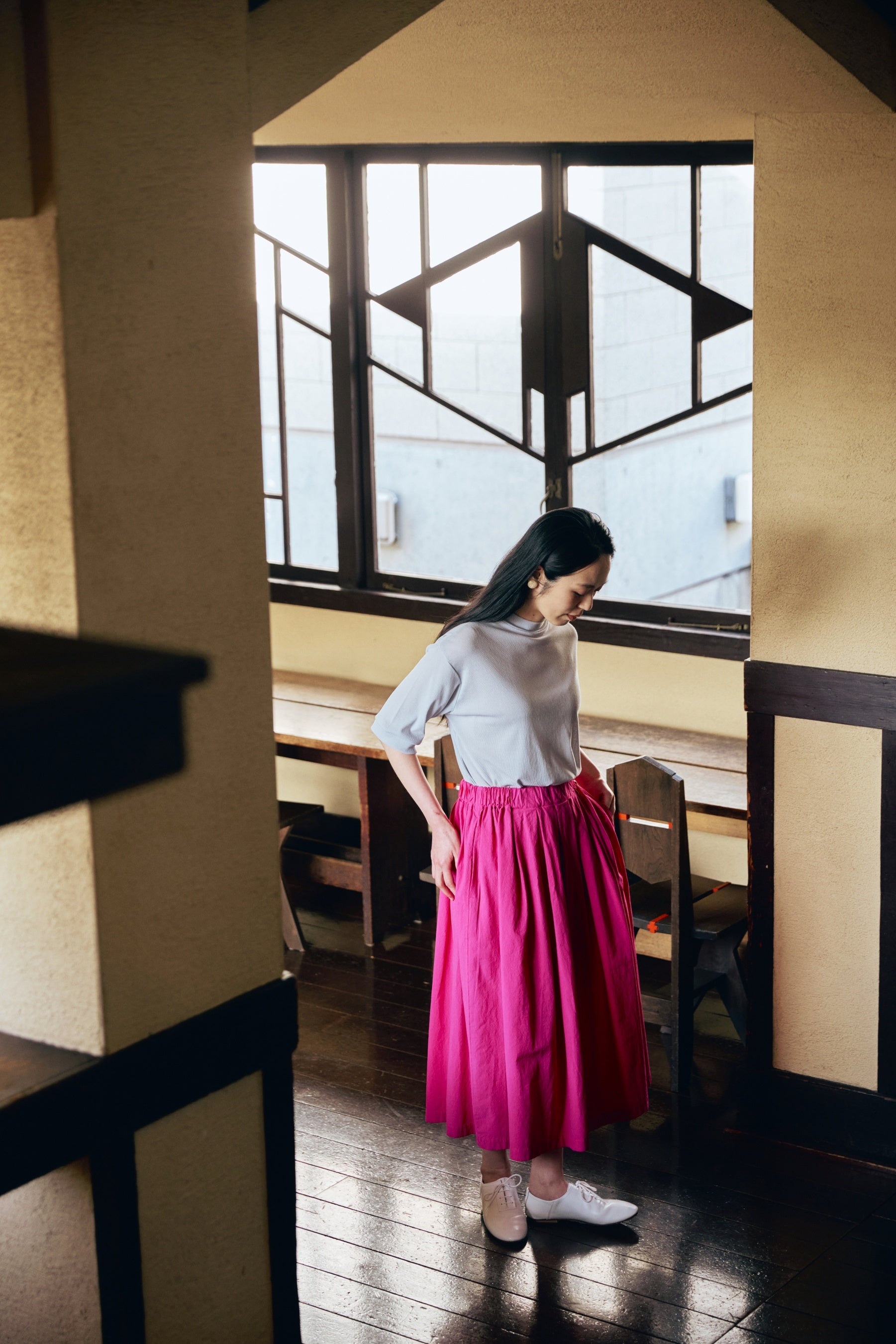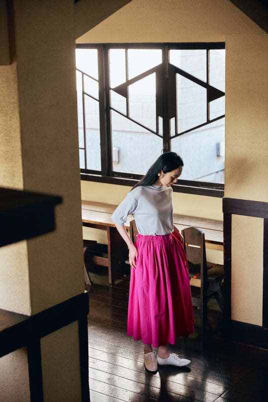 トップス:「コットンスーピマテレコボトルネック」1万450円(税込・ 3月発売予定) ボトムス:「ガーメントダイギャザースカート」1万9800円(税込・3月発売予定)