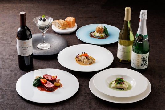 信州の食材を取り入れたコース料理とともに、マンズワインの個性を引き立てるペアリングを