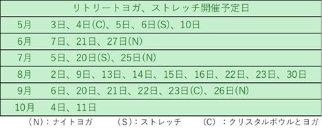愛妻家の聖地としても知られる嬬恋村。本イベントは「妻との時間をつくる旅」の観点からもご夫婦で同じ時間を共有し心と身体を整えていただくことも想定し朝の時間帯に行うモーニングヨガ、夜のおやすみ前のナイトヨガ、ストレッチを中心としたプログラムなどをご夫婦のご滞在シーンに溶け込めるよう設定しております。また一部日程ではクリスタルボウルの音色をバックに行うヨガ体験も取り入れ、自然と音が調和する特別な時間を演出いたします。雨天の場合には屋内会場にて実施するため、天候を気にせずご参加いただけます。
