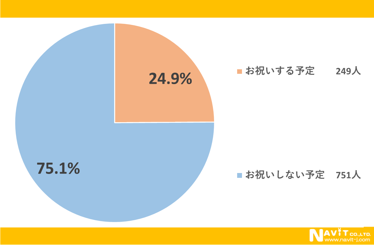 「ひな祭りをお祝いする予定はありますか?」という質問については、「お祝いする予定」が24.9%、「お祝いしない予定」が75.1%と、お祝いしない予定の人が7割強という結果になりました。