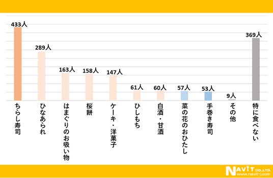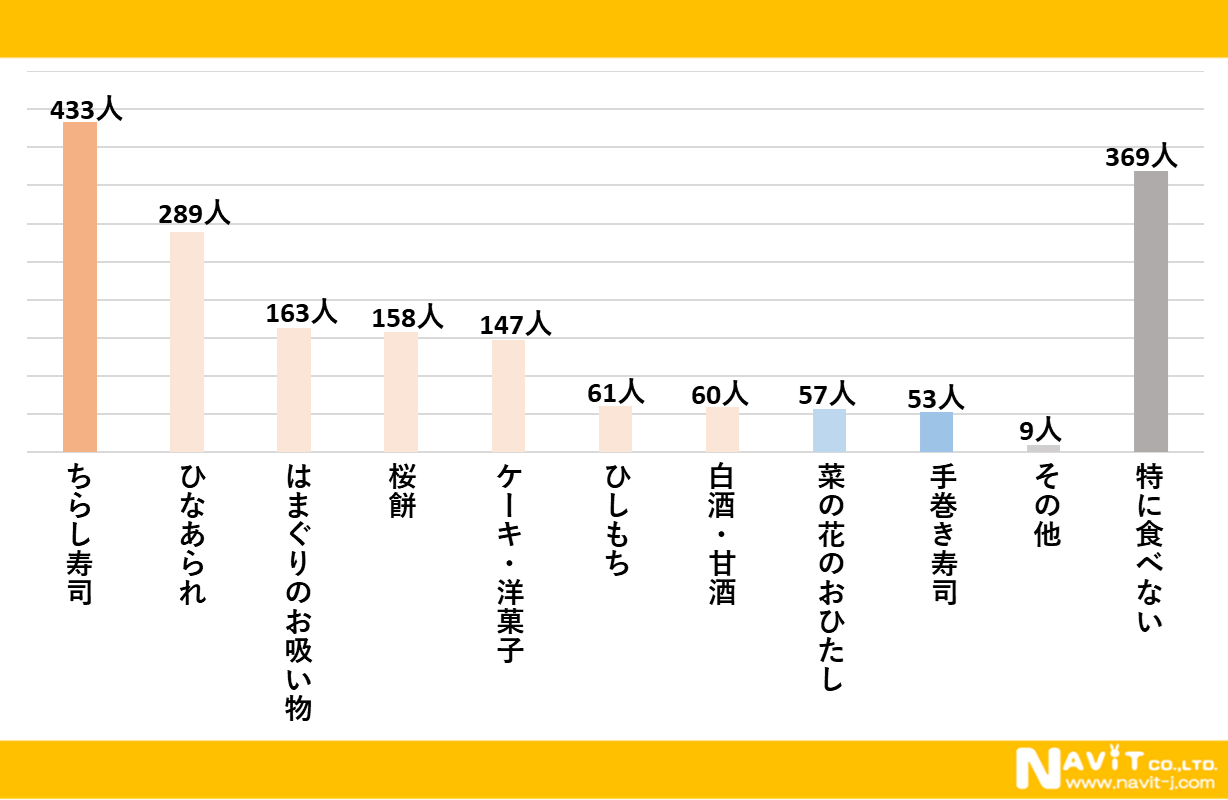 「ひな祭りに食べるものといえば何ですか?」という質問を複数選択可で行ったところ、「ちらし寿司」が433人、「ひなあられ」が289人、「はまぐりのお吸い物」が163人という順になりました。