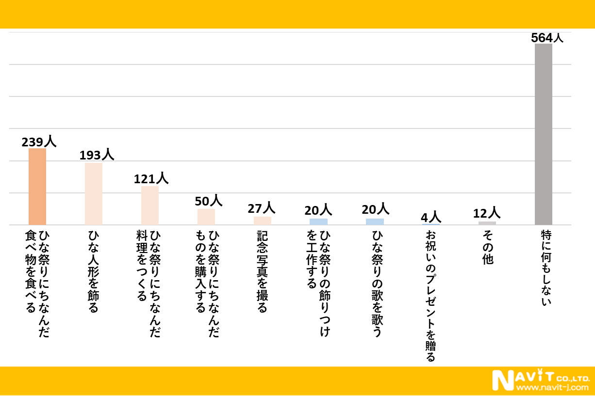 「ひな祭りで何をしますか?」という質問を複数選択可で行ったところ、「ひな祭りにちなんだ食べ物を食べる」が239人、「ひな人形を飾る」が193人、「ひな祭りにちなんだ料理をつくる」が121人という順になりました。また、「特に何もしない」と答えた人が564人いらっしゃいました。