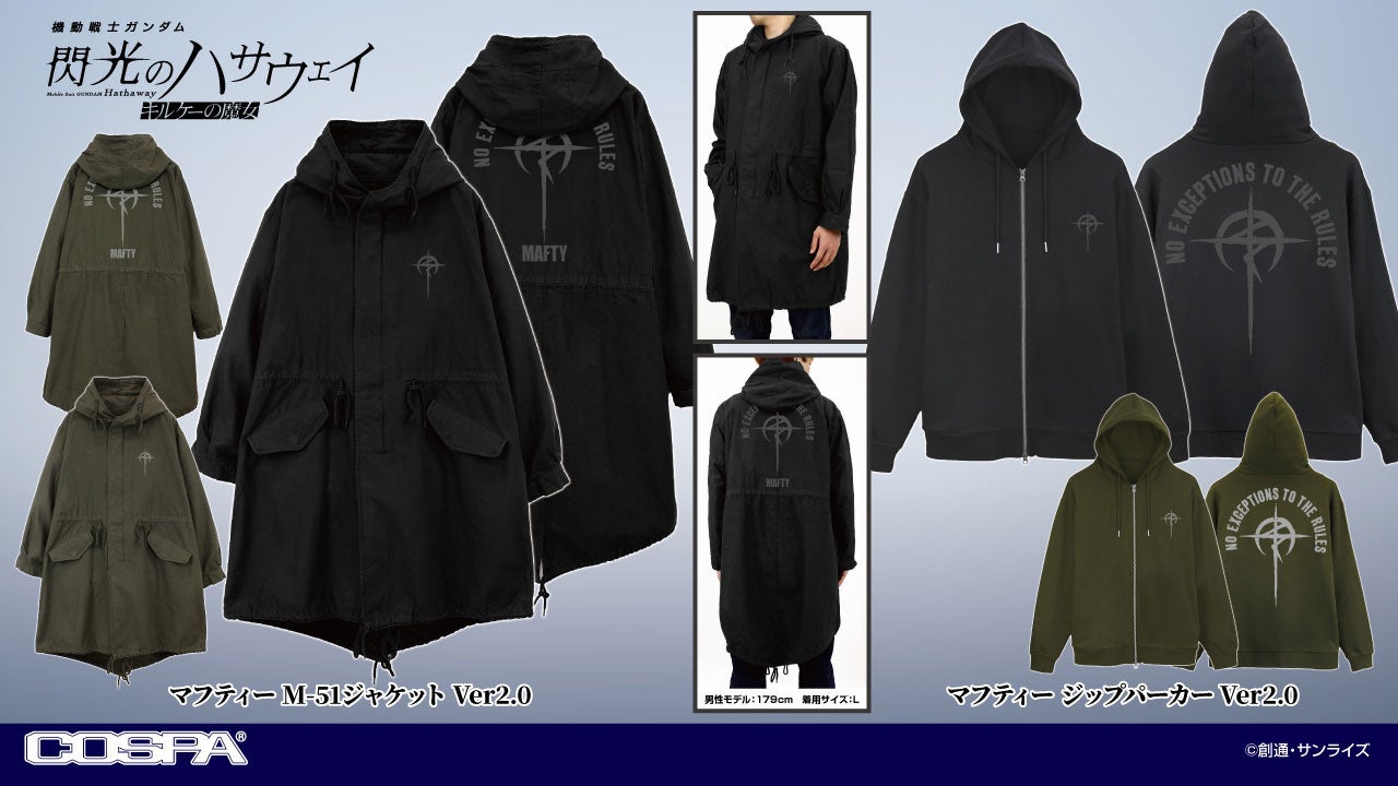 『機動戦士ガンダム』『機動戦士Zガンダム』『機動戦士ガンダム 第08MS小隊』『機動戦士ガンダムUC(ユニコーン)』『機動戦士ガンダム 閃光のハサウェイ キルケーの魔女』以上5タイトルのガンダム シリーズよりミリタリーファッションの定番「M-51ジャケット」「ファティーグジャケット」、そして「ジップパーカー」がラインナップ。