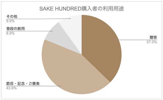 SAKE HUNDREDの購入者アンケート(2025年1月1日~2025年12月31日計測)によると、全体の37.3%が「贈答用」として利用されています。また、節目や記念日、自分へのご褒美といった特別なシーンでの利用も43.9%と多く、全体の約8割が「贈答」や「節目・記念」といった特別なシーンで選んでいることが分かります。