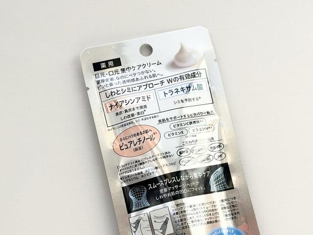 摩擦で色素沈着を起こしやすい目周りはもちろん、年齢を重ねて影が現れてきた口周りのケアにも◎。頼りがいのあるサポート成分がてんこもり!