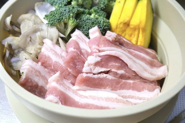 今回は、にんじんやブロッコリーなどの野菜と豚肉を一緒に蒸してみました。