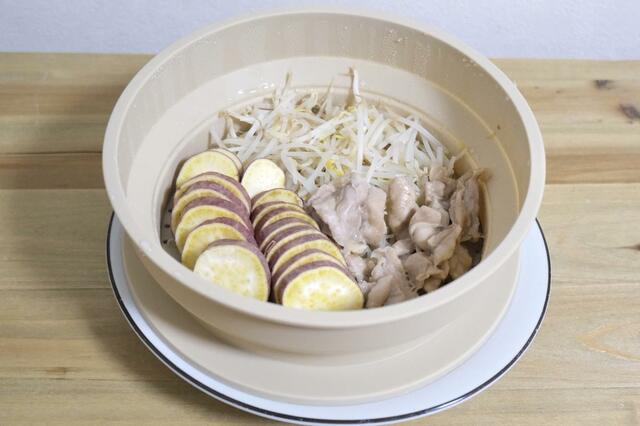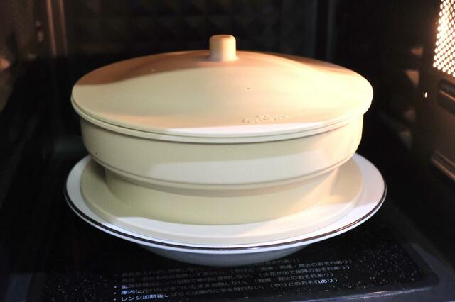 食材を並べてフタを閉じ、お皿にのせて加熱するだけ。