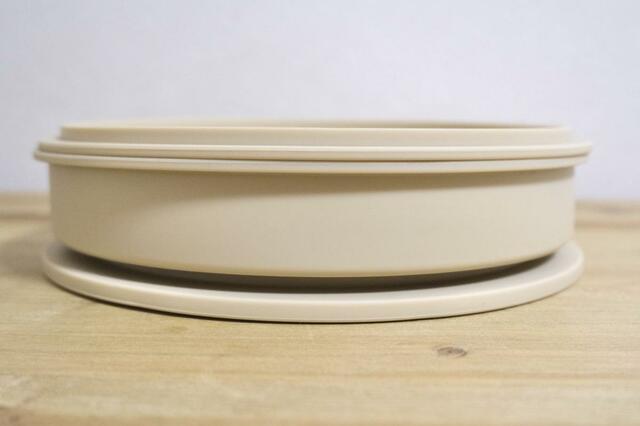 直径約21cmとたっぷり入るサイズ感ながら、フタを裏返して重ねると約5cmの薄さに。