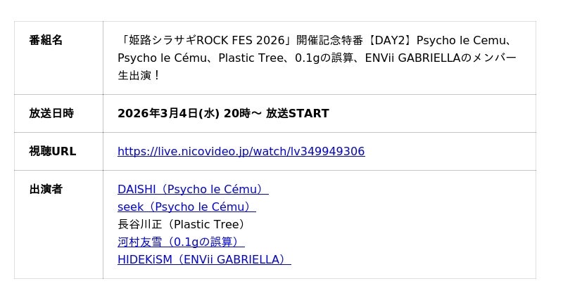 「姫路シラサギROCK FES 2026」開催記念特番【DAY2】Psycho le Cemu、Psycho le Cemu、Plastic Tree、0.1gの誤算、ENVii GABRIELLAのメンバー生出演!
