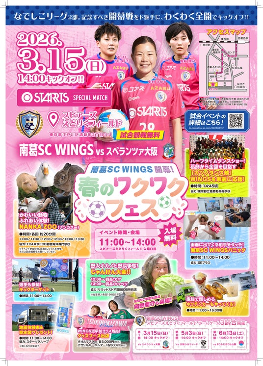 またこの日は当日イベントとして『南葛SC WINGS 春のワクワクフェス』を実施します。移動動物園、地震体験車、キックターゲット、また各ブースでスターツグループ様より、緊急時に最大約5リットルの水を運ぶことができる防災グッズ、給水袋のプレゼントなど、ホーム開幕戦を記念する様々なイベントを実施予定です。