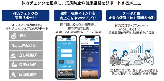 ALPHA for Bizは、従業員の健康・体力課題をデータで可視化することで健康・運動に対するマインドを高め、労災防止や健康経営の取り組みをサポートするサービスです。具体的には以下3つのサービスで構成されています。