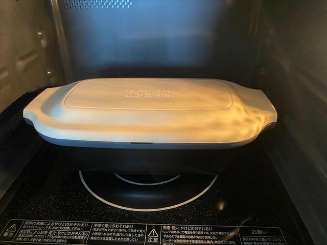 通常のフライパン調理では7分かかるところ、電子レンジ調理では5分で完成。約2分の時短になりました!取り出す際は本体が熱くなっているため、やけどには注意してくださいね。