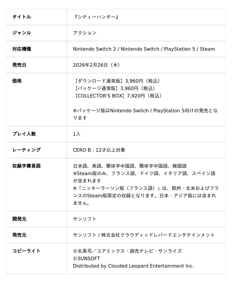 サン電子株式会社(本社:愛知県名古屋市、代表取締役社長:内海 龍輔、東証スタンダード:6736)のゲームブランド「SUNSOFT(サンソフト)」は、1990年にPCエンジンで発売された唯一の公式ゲーム『シティーハンター』を、現行のゲーム機(Nintendo Switch(TM)2/Nintendo Switch(TM)/PlayStation(R)5/Steam(R))で鮮やかに蘇る「決定版」として、2026年2月26日(木)に全世界同時発売いたします。