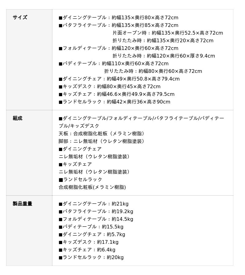 ダイニングテーブル/フォルディテーブル(折りたたみテーブル)/バタフライテーブル(両面折りたたみテーブル)/バディテーブル(伸長テーブル)/キッズデスク