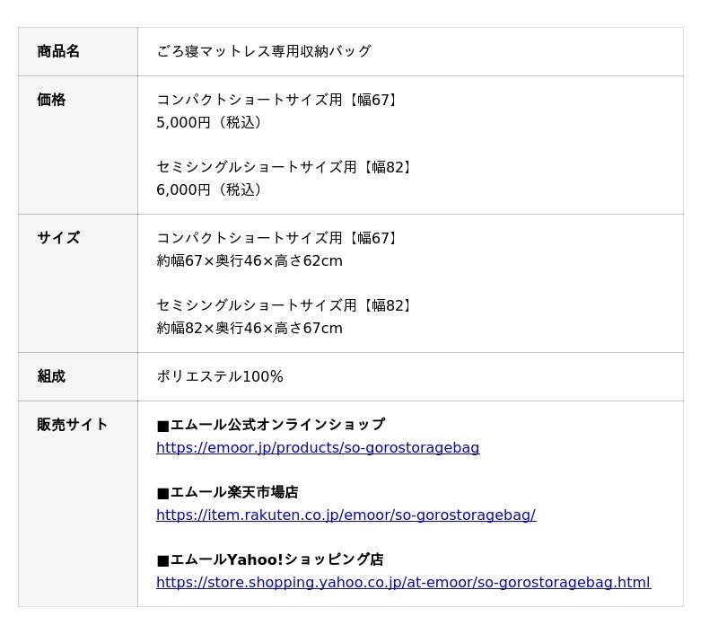 「身体に合った寝る・座る・たたむ」を提供する健康家具ブランドEMOORを展開する株式会社エムール(東京都立川市:代表取締役 高橋 幸司/以下、エムール)は、2026年2月25日より「ごろ寝マットレス専用収納バッグ」の販売を開始しました。