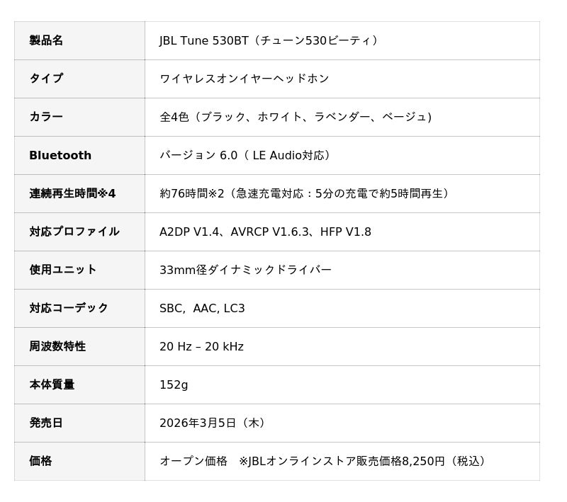 ハーマンインターナショナル株式会社(本社:東京都千代田区、代表取締役:桑原拓磨)は、アメリカ カリフォルニア発祥の世界最大級のオーディオブランドであり、日本においてワイヤレススピーカー8年連続販売台数No.1※1に輝く「JBL」から、人気のワイヤレスオンイヤーヘッドホンのアップグレードモデル「JBL Tune 530BT」を2026年3月5日(木)より発売いたします。