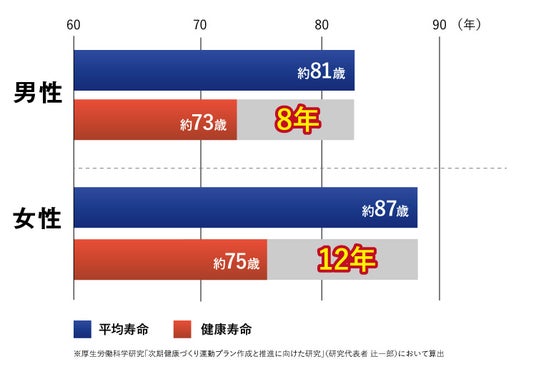また、日本は世界有数の長寿国ですが、厚生労働省が公表しているデータによれば、平均寿命と健康寿命の間にはおよそ10年前後の差があるといわれています。*2