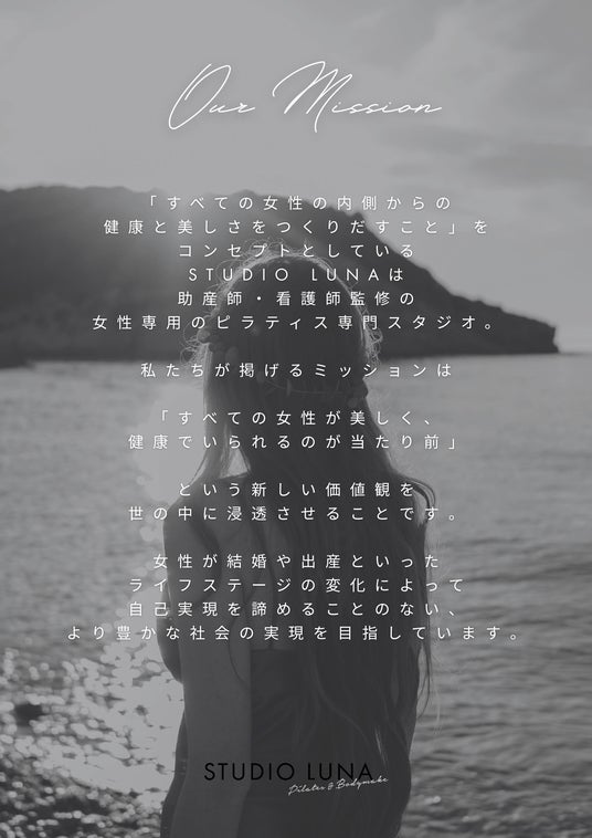 STUDIO LUNAが掲げるミッションは「すべての女性が美しく、健康でいられるのが当たり前」という価値観を世の中に浸透させることです。多くの女性が、ライフステージの変化によって自分のキャリアや美容、健康を二の次にしてしまう現状があります。私たちは、出産や育児という素晴らしい経験が、自己実現を諦める理由になってはならないと考えます。医療国家資格者(助産師・看護師・保健師)が監修し、心身の土台を整えることで、女性がより豊かに、自由に生きられる社会を実現します。