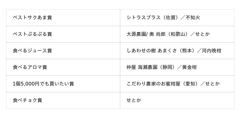 また、金賞にはきまぐれファーム(神奈川県)の「湘南ゴールド」、銀賞には土佐水谷農園(高知県)の「土佐文旦」、銅賞には木下農園(愛媛県)の「せとか」が選出。柑橘王国として知られる愛媛・和歌山・静岡のみならず、これまで柑橘のイメージが強くなかった地域からも高評価が相次ぎ、日本各地に高水準の柑橘生産者が存在することが改めて示されました。