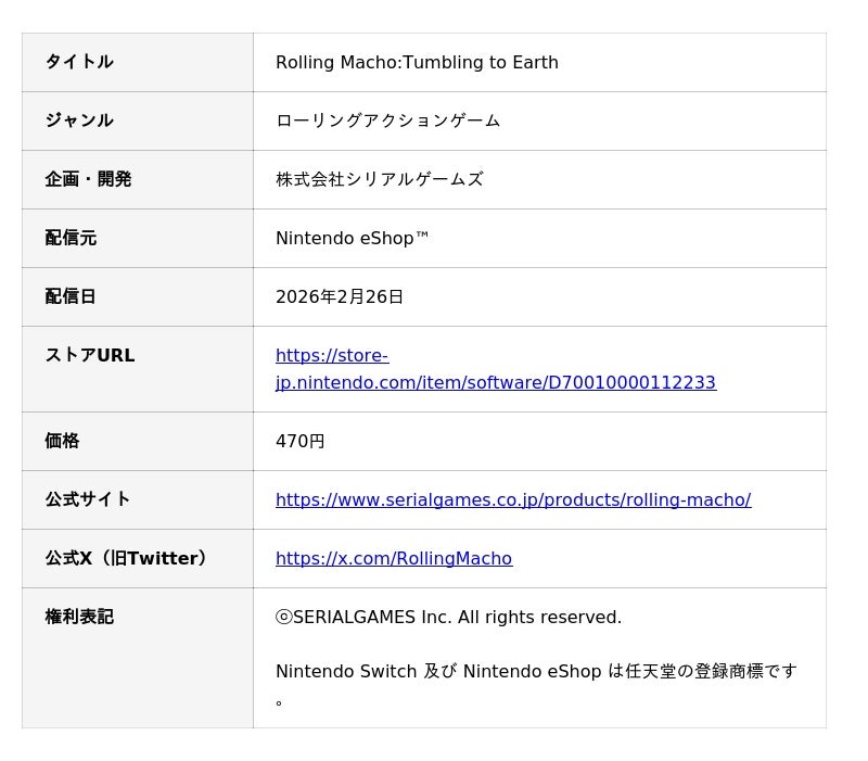 株式会社シリアルゲームズ(本社:東京都台東区、代表取締役社長:吉澤 匡)は、ローリングアクションゲーム『ローリングマッチョ(Rolling Macho: Tumbling to Earth)』のNintendo Switch(TM)版を、2026年2月26日(木)より配信開始いたします。