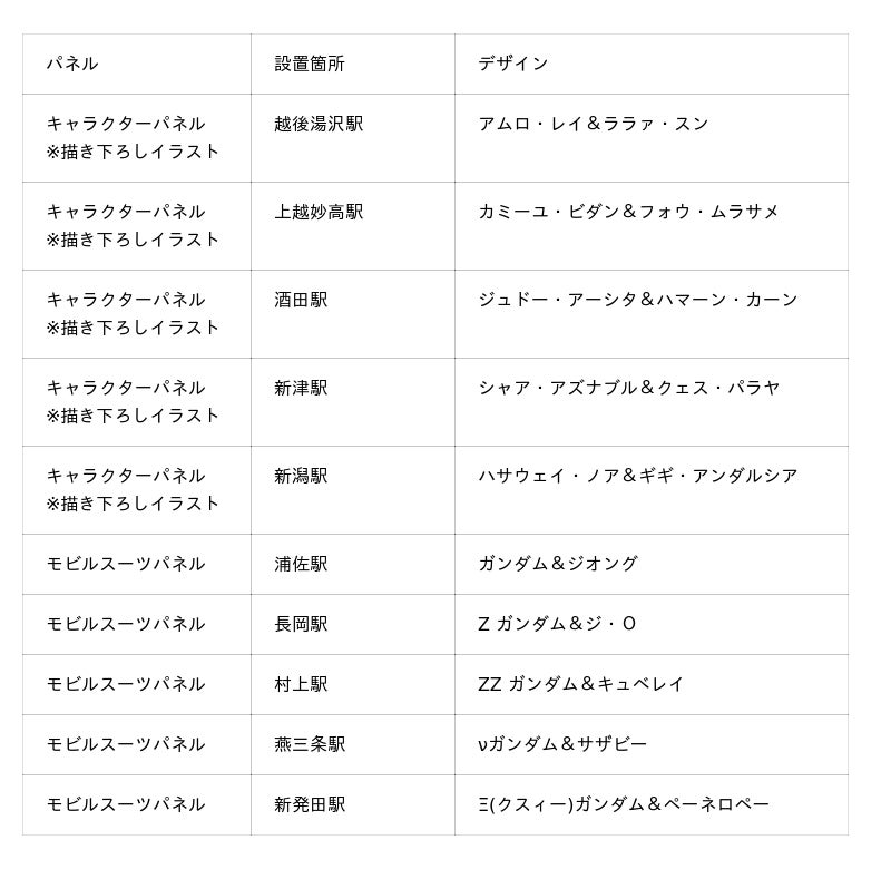 以下の各駅では描き下ろしイラストを使用したキャラクターパネルや、モビルスーツパネルを設置します。