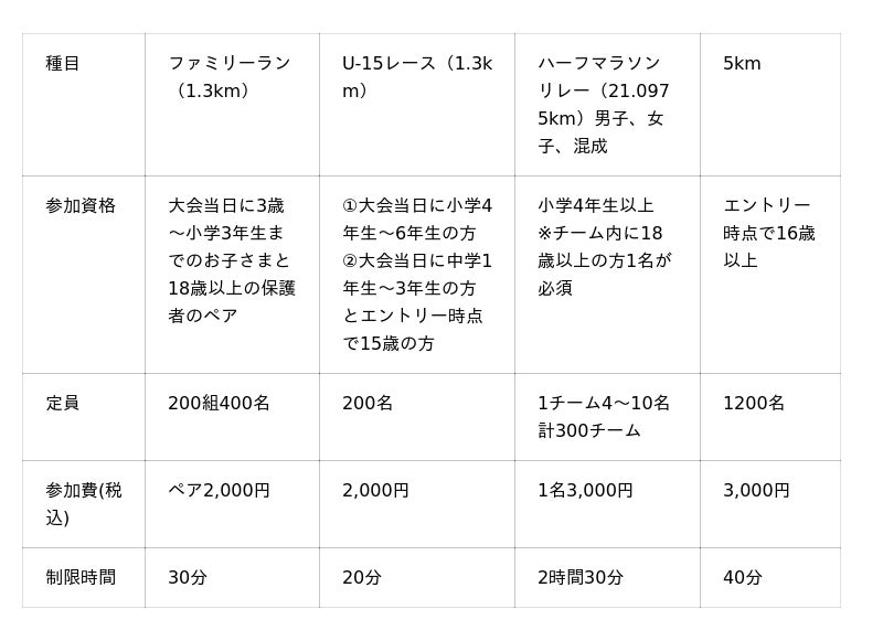 ハーフマラソンリレーは、1チーム4名から10名で参加いただくチームリレーマラソンです。U-15レースは、小学4年生~エントリー時点で16歳未満の方までが参加できる男女混合レースです。ファミリーランは、3歳から小学3年生までのお子さまと保護者のペアで参加できる約1.3kmのファンランです。