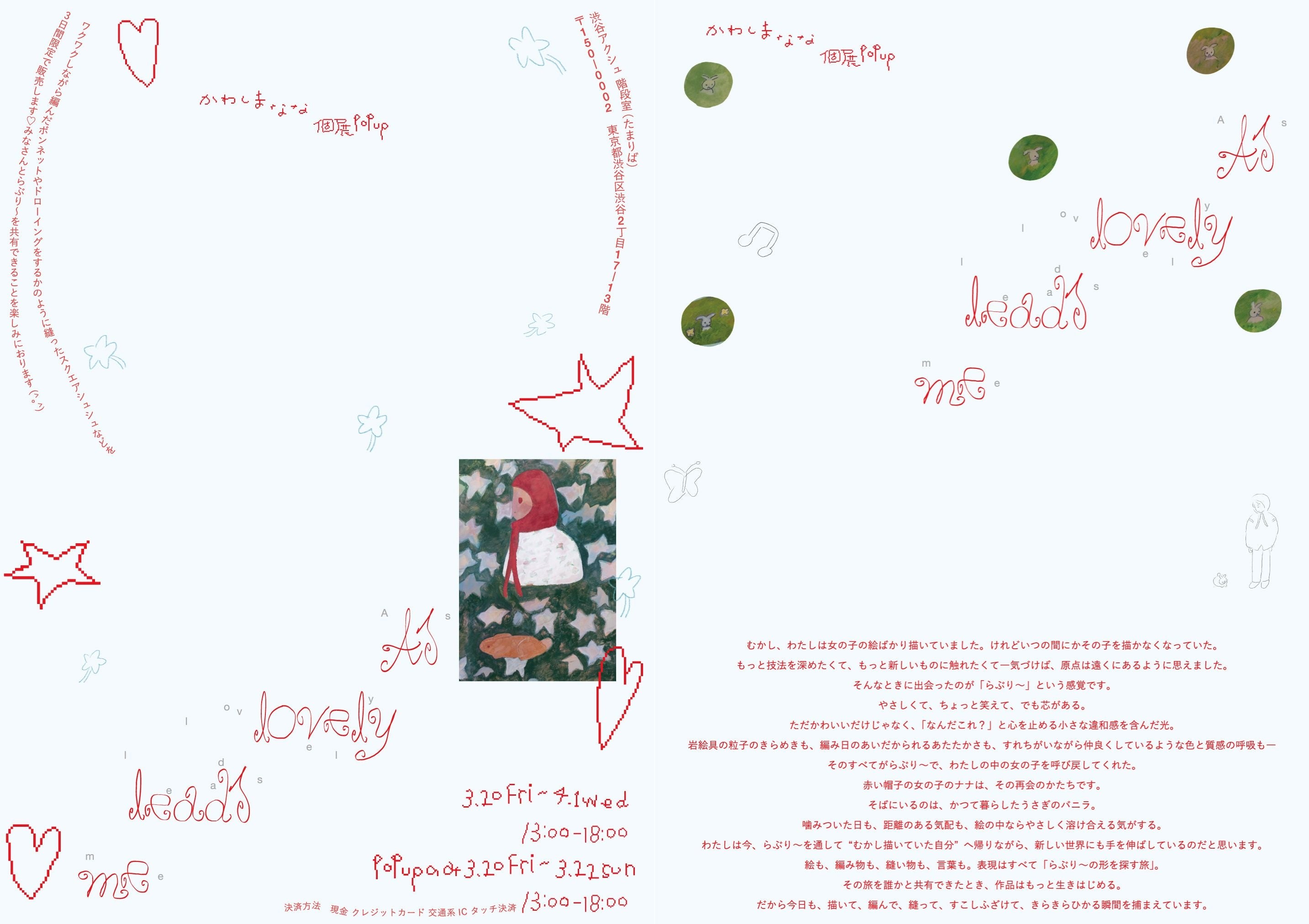 株式会社シアターワークショップ(東京都渋谷区)は、運営・管理をしている渋谷アクシュ3階のユニークなレンタルスペース「階段室(たまりば)」(所在地:東京都渋谷区)にて、河嶋菜々氏による個展popup『As lovely leads me.』を2026年3月20日(金)~4月1日(水)にかけて開催いたします。期間内の3月20日(金)~22日(日)はシュシュや編み物の販売も実施いたします。