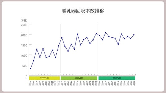 3年前から本格的にはじめた本活動は、開始当初から多くのご家族に反響をいただいています。現在では、全国で1ヵ月に約2,000本の哺乳器が回収されており、その回収本数は年々増加しています。