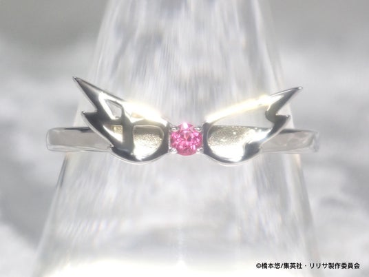 キャラクターたちのコスプレ後の天使の羽や衣装の柄をモチーフにデザインしたジュエリーです。中央にはイメージカラーに合わせたホットピンクスピネル、アメジスト、スイスブルートパーズ、イエローサファイアをそれぞれセッティングしています。日常使いしやすい、可憐でシンプルなデザインに仕上げました。宝石はすべて宝石鑑定士が色味や輝きを確認し、キャラクターの世界観に合う天然石を厳選しています。TVアニメ「2.5次元の誘惑」×KARATZコラボ リング