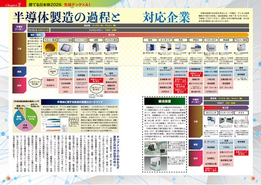 「第2章 先端テック×AI」では国策として期待が高まる半導体、量子コンピューター、AI、フィジカルAI、データセンター、サイバーセキュリティ関連銘柄を解説しています。半導体に関しては、わかりやすい図で製造工程を掲載。また、量子コンピューターの簡単な解説なども掲載し、先端技術の「わからない」を解決します。
