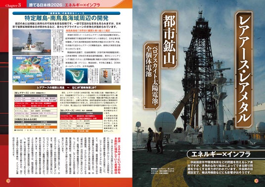 「第3章 エネルギー×インフラ」では、核融合発電、資源・エネルギー、防災・国土強靭化、レアアース・レアメタル、都市鉱山、ペロブスカイト太陽電池・全個体電池などを解説し、関連銘柄も網羅。直近ニュースになった南鳥島のレアアース採集関連も取り上げています。