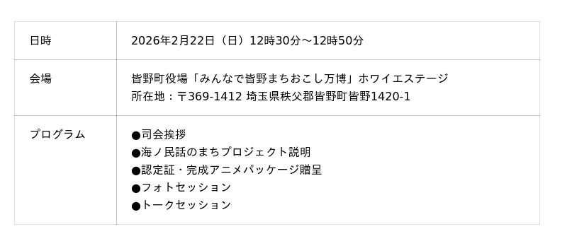 一般社団法人日本昔ばなし協会が取り組む「海ノ民話のまちプロジェクト」は、2026年2月22日(日)に埼玉県皆野町を舞台にした海ノ民話アニメーション「カミの話」が完成したため、アニメ監督が皆野町を訪問し「海ノ民話のまち」認定式を実施しました。また、同日、皆野町役場で開催された「みんなで皆野まちおこし万博」に出展し、完成アニメーションのお披露目をおこないました。