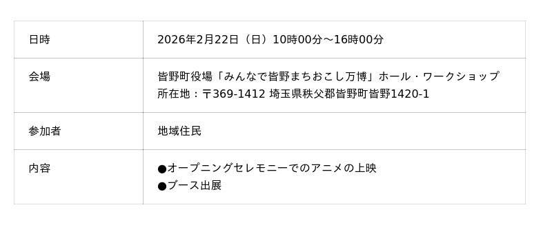 日時:2026年2月22日(日)上映・出展:10時00分~16時00分/表敬訪問:12時30分~12時50分 場所:皆野町役場 「みんなで皆野まちおこし万博」会場内