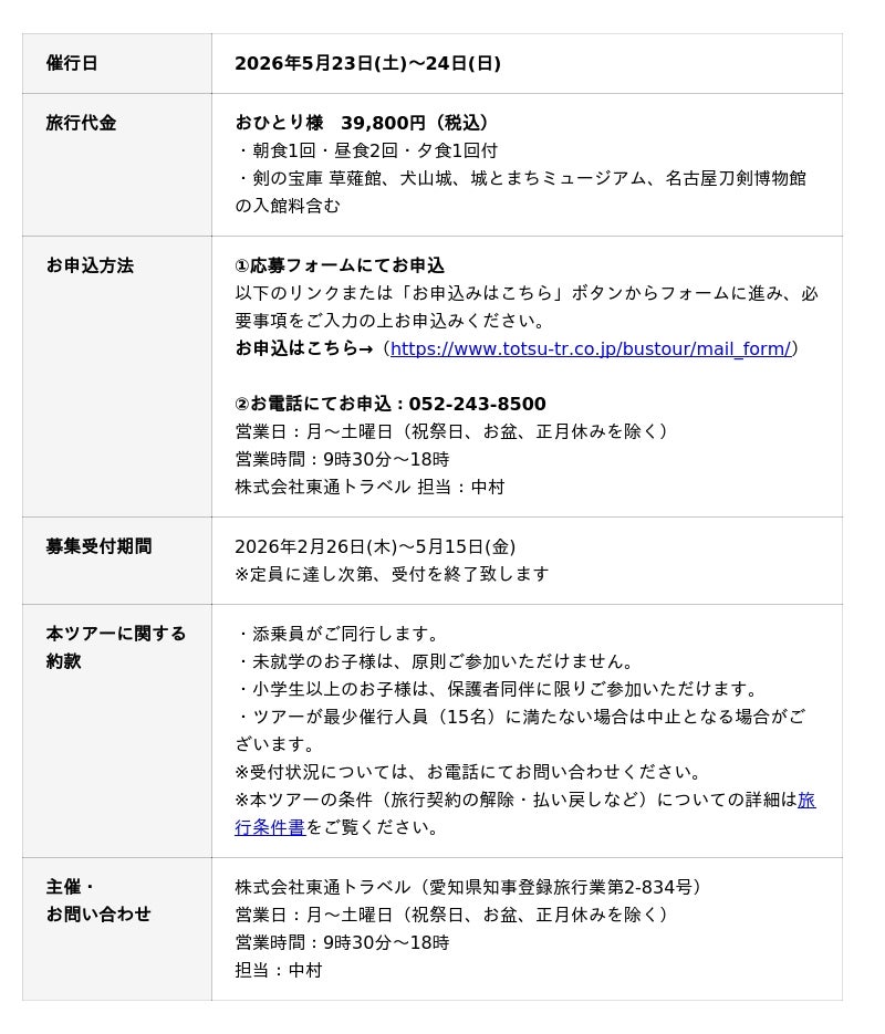 さらに旅の目的地として、熱田神宮・犬山城・名古屋刀剣博物館と三か所の名所観光を楽しめる、まさに「ひとつの旅で、ふたつの兼光、みっつの名所を巡る」ツアーです。