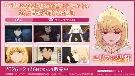 『エリスの聖杯』コンビニプリントでは、話題のキービジュアル、各キャラクターのイラストを使用したブロマイドやシールなど、美しいビジュアルを堪能することが出来るファンも納得のクオリティで提供します。場面写は各話放送終了1週間後の11:00以降に順次追加される予定です。