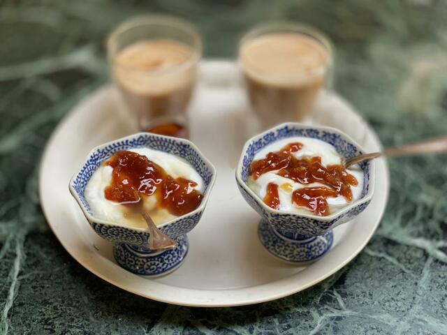 プロテイン、今日の元気、ヨーグルト(橙のpeel)、café au lait.