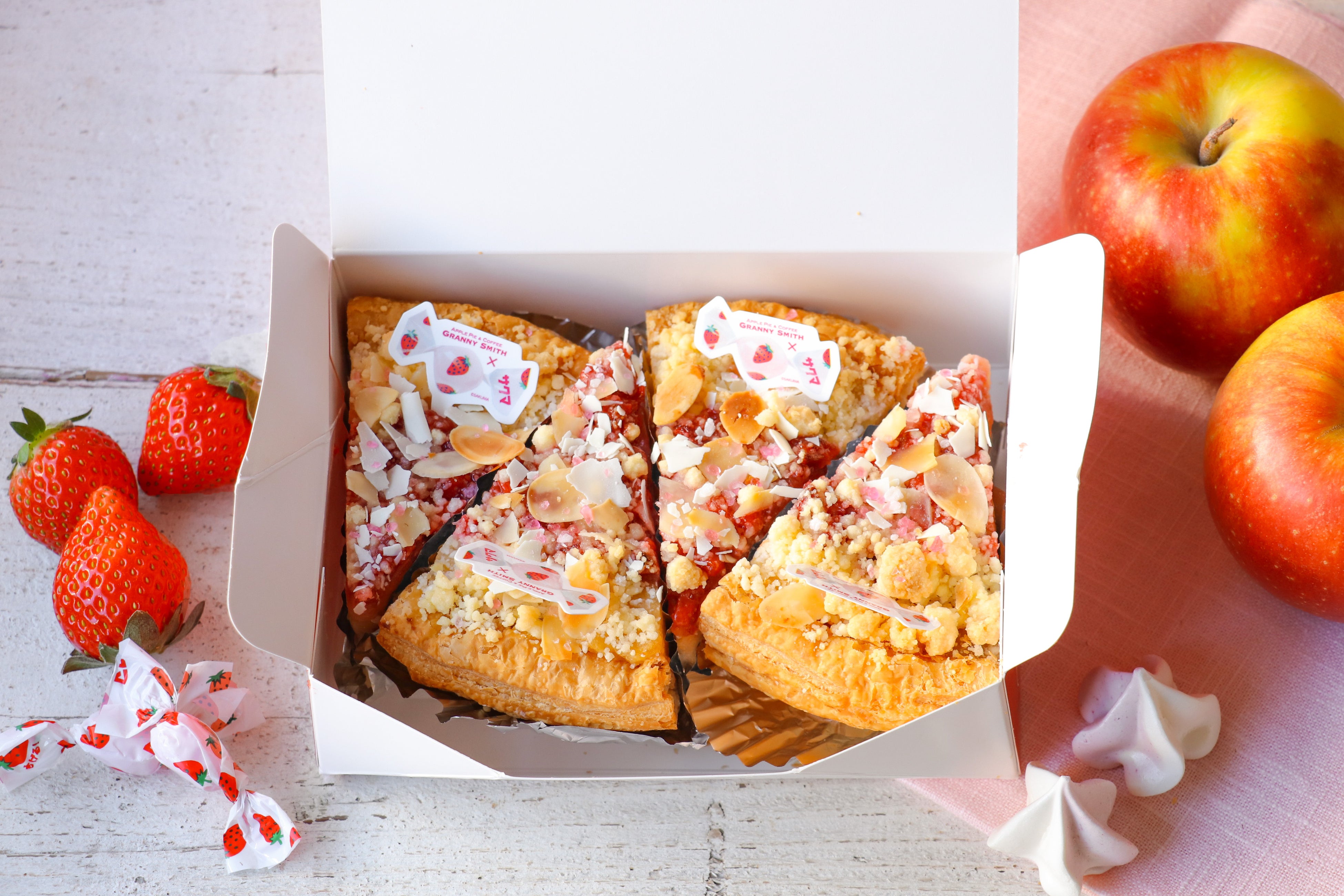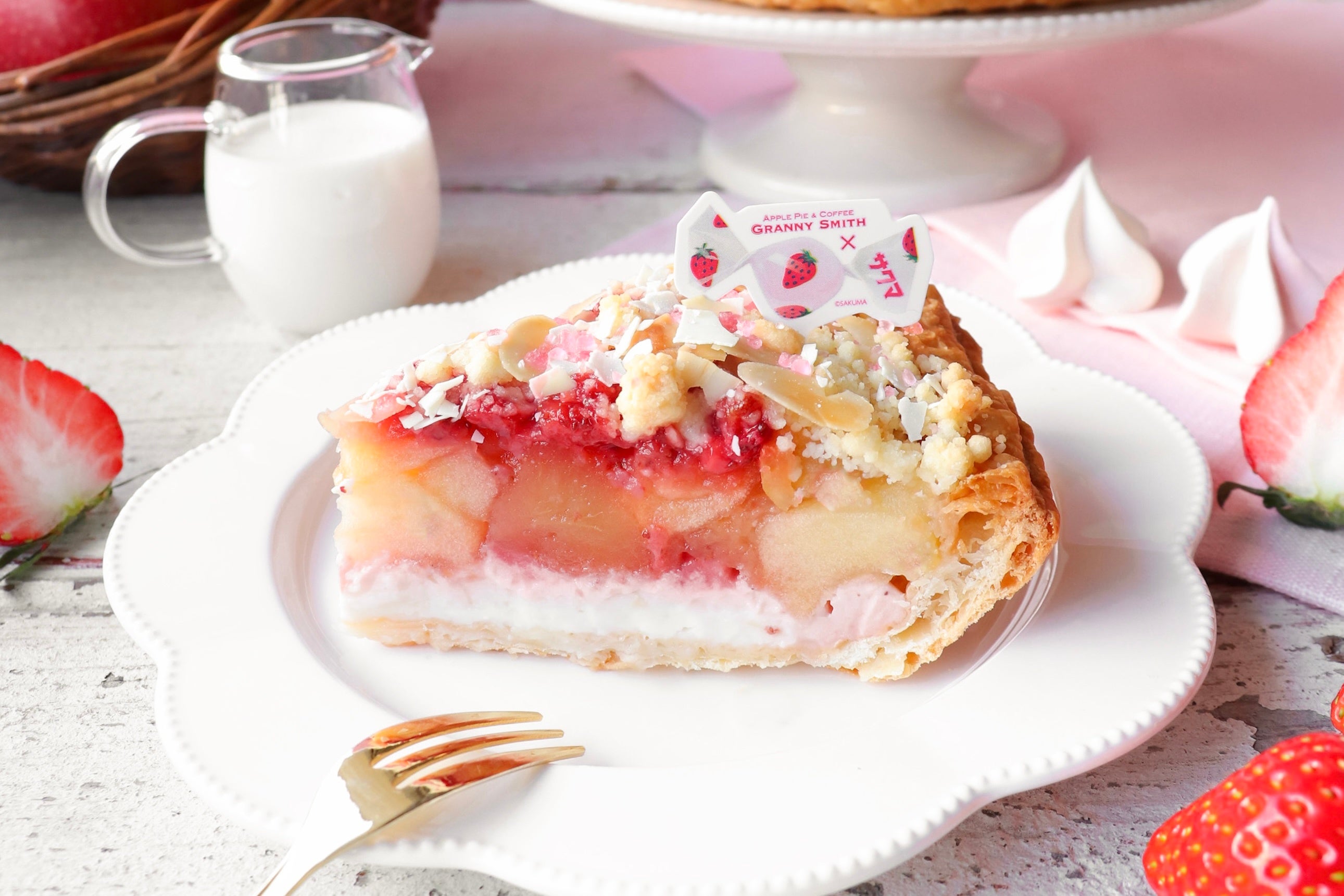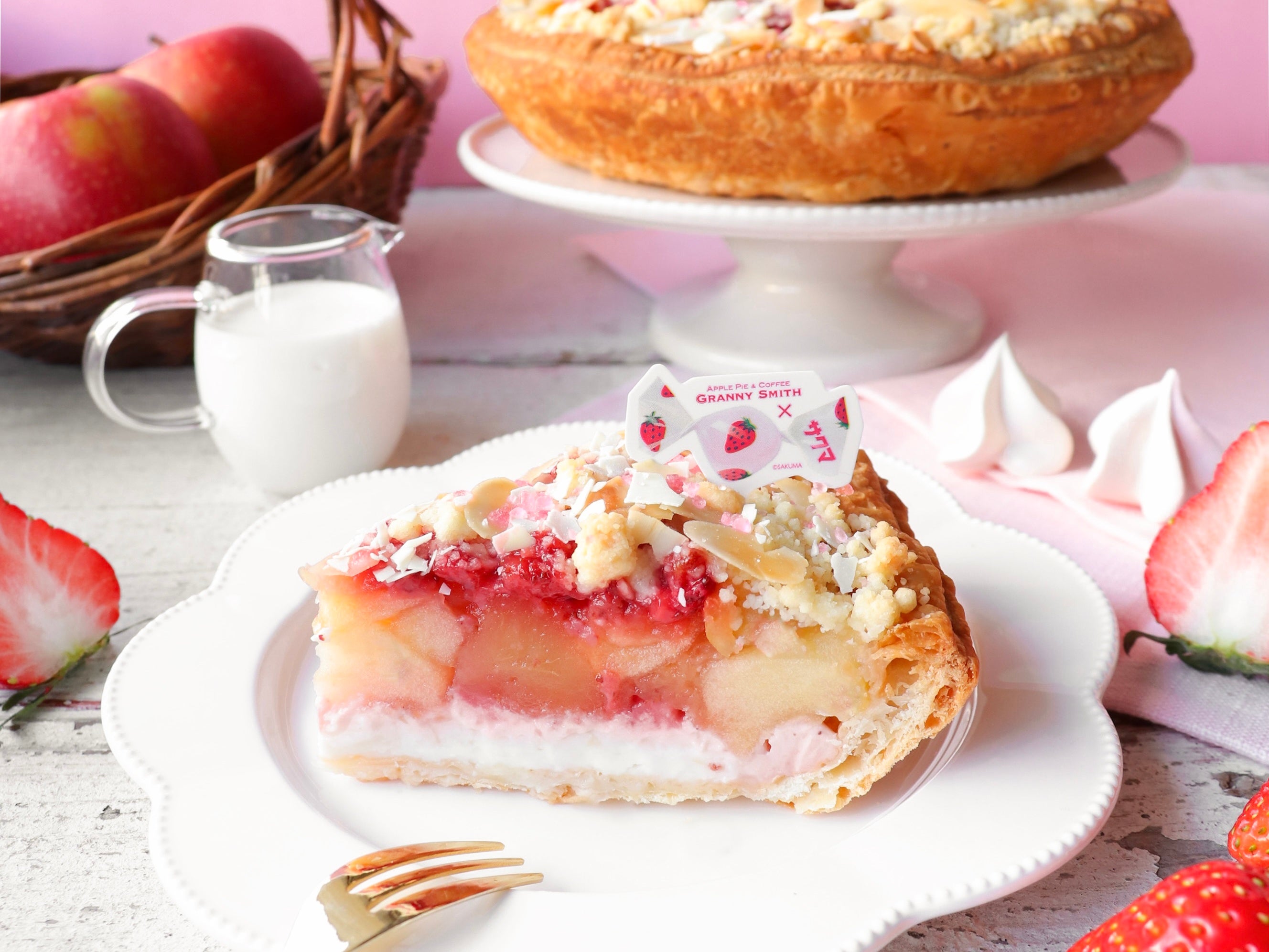 グラニースミス今春の新作は、1970年の発売以来、長年愛され続けているサクマ製菓のロングセラー商品「いちごみるく」との特別なコラボレーションアップルパイです。