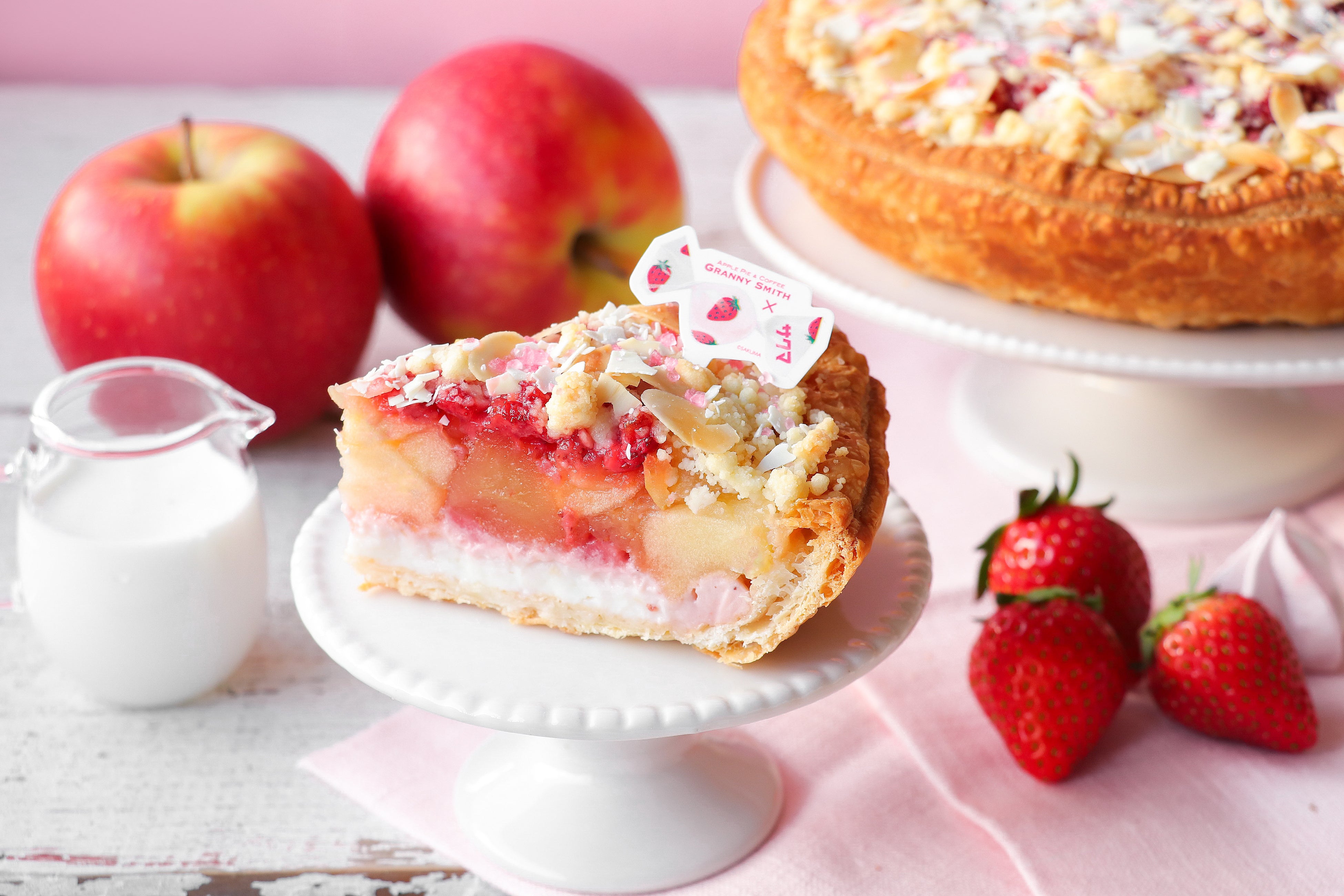 アップルパイとのペアリングにもぴったりな、グラニースミスオリジナルコラボドリンク『いちごみるくセーキ』も同時発売。