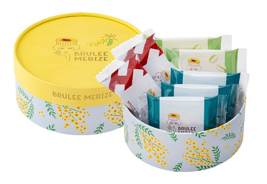 季節限定味のピスタチオタルトも入った春限定のギフトボックスが新登場!華やかなミモザ柄のボックスの中には3種類のブリュレスイーツを詰合せました。芳醇な味わい『ブリュレクリームタルト ピスタチオ』、パリとろ食感が香ばしい代表作『ブリュレクリームタルト』、香ばしいパイ仕立ての『ブリュレミルフィーユ』。心がぱっと明るくなるような黄色のパッケージは、日ごろの感謝を込めて贈る“ミモザの日”のプレゼントにおすすめです。