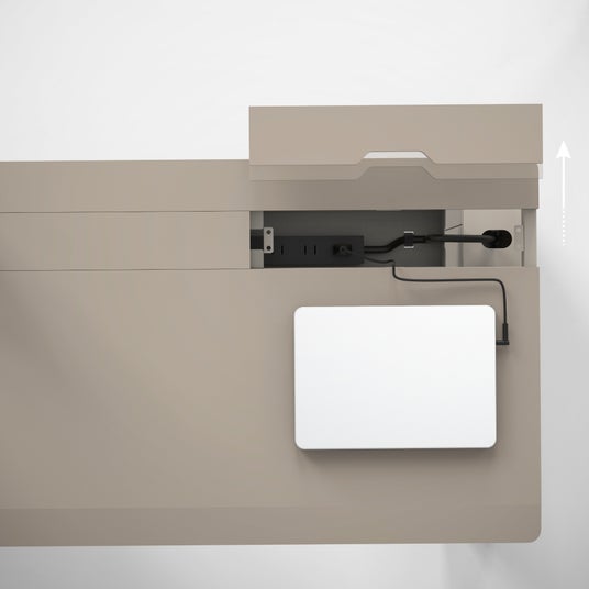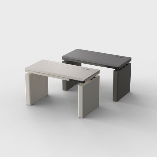 カラーは、住まいに馴染むペールベージュとチャコールグレイ。オフィス感を抑え、家具としての美しさを備えた、暮らしに寄り添う電動昇降デスクです。