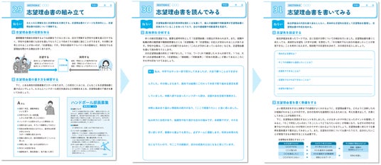 大学入試で急速な拡大を見せる総合型選抜・学校推薦型選抜をはじめ、専門学校の志望動機書や就職活動など、志望理由はさまざまな選考場面で求められます。そこで、「志望理由を書く力」の習得をめざし、「組み立てを学ぶ」、「読んでみる」、「書いてみる」の3ステップで学べるワークを「SECTION α(アルファ)」として新たに導入しました。