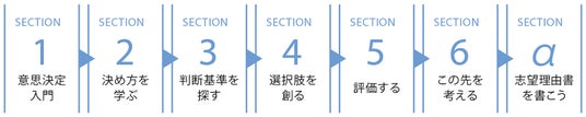 『ミライの選択』では、6つのセクションに沿って意思決定の方法を学びます。学校の狙いや生徒の特性に合わせ、教員が自由に選べる全31のワークをもとに、生徒は自身と向き合い、クラスメイトと対話を通してじっくりと自己理解を深めます。この過程で、生徒は納得のいく進路を選ぶ方法を身につけていきます。