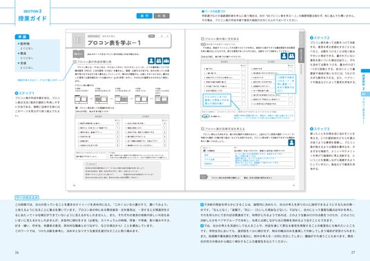 スムーズに授業を進められるよう、授業案や各ワークの指導ポイントを強化しています。各セクションの冒頭には、狙いや前後とのつながりなど、授業の見通しに役立つガイドを掲載しました。ワークごとの授業ガイドでは、生徒が取り組む各ワークの詳細な解説に加え、想定時間や指導上の留意点など、授業進行に必要な情報を網羅しています。