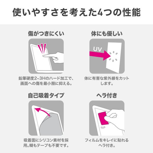 鉛筆硬度2~3Hのハード加工で傷がつきにくく、紫外線をカットし体にも優しい設計です。吸着面にシリコン素材を使用しており、ヘラを付属しているので、簡単にキレイに貼れます。