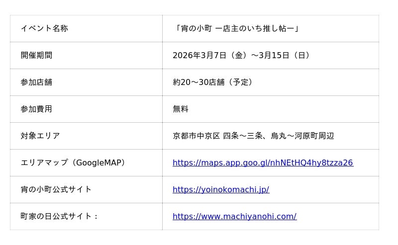 京都・四条~三条エリアの町家店舗が集まる「宵の小町」では、2026年3月7日(金)~3月15日(日)の期間、「町家の日(3月8日)」にあわせた連動企画『宵の小町 ー 店主のいち推し帖 ー』を開催します。3月8日は「まち(3)や(8)」の語呂合わせから生まれた京都各地で町家公開や文化イベントが実施される、町家の保存と活用を考える記念日です。本企画では、エリア内の飲食店・小売店約30店舗が参加し、共通フォーマットの台紙に“自店のいち推し”を記入して店頭に掲示。店主自らの言葉で町家の魅力や店の楽しみ方を発信し、来街者に“町家の内側の価値”を体験してもらう回遊型の取り組みです。
