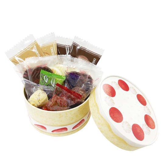 ケーキのデザインの直径約12cm×深さ約6cmの箱にチョコレートを詰めてお持ち帰りいただけます。