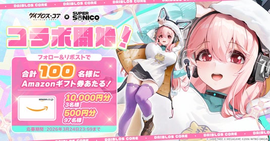 2026年2月26日(木)メンテナンス後から3月26日(木)メンテナンス前まで、ニトロプラスのライブイベント「NITRO SUPER SONIC」の人気マスコットガール「すーぱーそに子」とのコラボレーションイベントを開催いたします。さらに公式X(旧Twitter)では、コラボ開催を記念したリポストキャンペーンも実施中です。