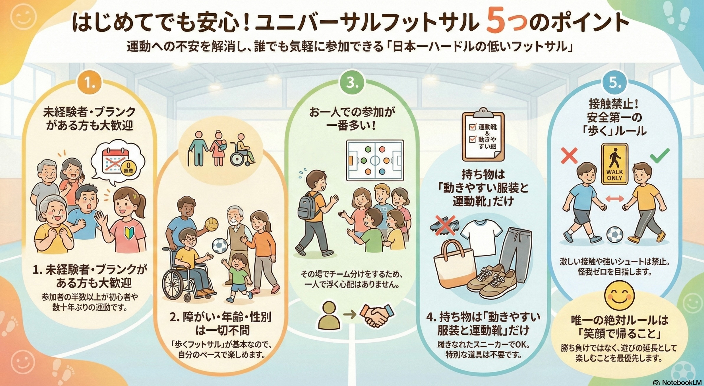通常のフットサルとは異なり、日本サッカー協会(JFA)も推奨する「ウォーキングフットボール」のルールの一部を採用して、誰もが安心して参加できるオリジナルルールで実施します。
