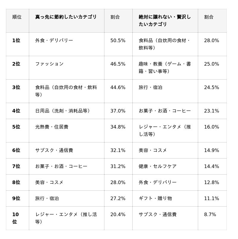 家計における優先順位の変動と、消費者が抱く購買心理を可視化しました。データ1:【家計の優先順位】節約 vs 譲れない贅沢(TOP10)