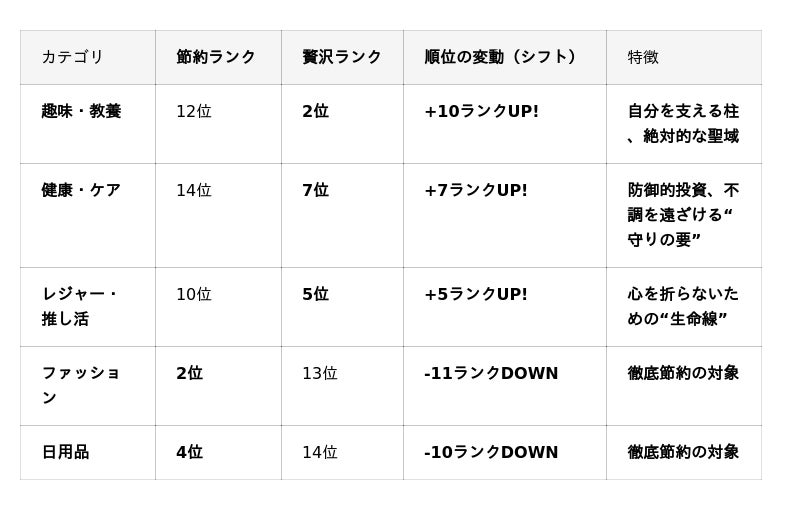 「趣味・教養」等は節約ランキングでは下位(10位~12位)ですが、贅沢ランキングでは2位・5位へ一気に急浮上しました。これは消費者がこれらを余暇ではなく「自分を保つ最後の砦」と位置づけている証拠です。節約意向に対し贅沢意向が2倍以上に達しており、値上げ下でも支出を惜しまない、唯一無二の「聖域」カテゴリとなっています。